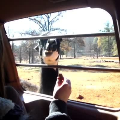 Teen girl feeds llama from car at drive-thru zoo, llama spits huge loogie in car, family screams.