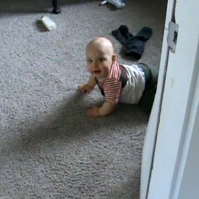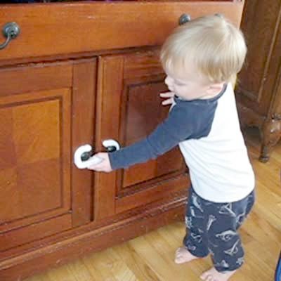Tot boy opens a childproof locked cabinet. He makes a cute face when he gets the door open.
