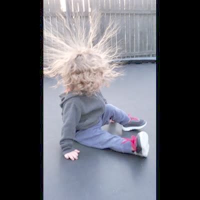 A tot boy jumps on a trampoline and the static makes his hair stands up.