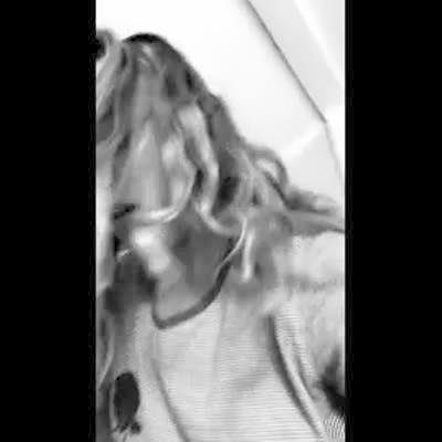Cameraman asks woman to flip her hair. She shakes her head, bends over, gets into it. When she pops back up her wig falls off & she laughs. Embarrassed.