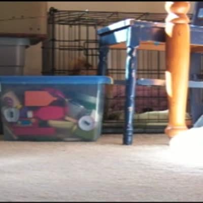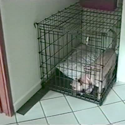 Small dog locked in a cage lifts the cage up with its mouth until a space exists at the bottom, then the dog squeezes itself underneath & gets out. Animal escapes. Hidden camera.