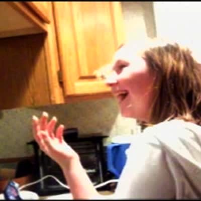 Teen girl uses electric mixer on bowl of cheese balls, bends down to look into camera & gets her hair caught in the beaters. With recovery.
