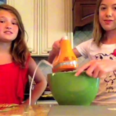 Two girls are making a cooking video. One of the girls gets hair stuck in blender at end.