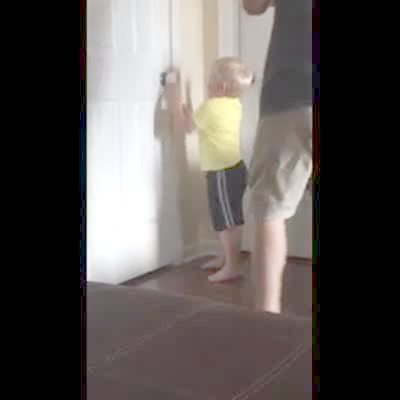 A man tells his young son that he "can't get in" then the boy says, "yes, I can" and he slaps at a child lock on the doorknob until the lock falls off and the boy opens the door and walks in.