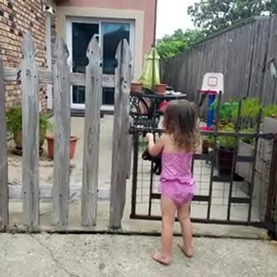 A tot girl locks her dog in the yard with a gate and the dog crawls through a gap in the fence next to the gate.