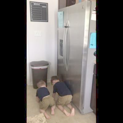A young boy stands on his tot brother's back. He attempts to use him as a stool to get the child lock off the fridge. He is successful. At home.