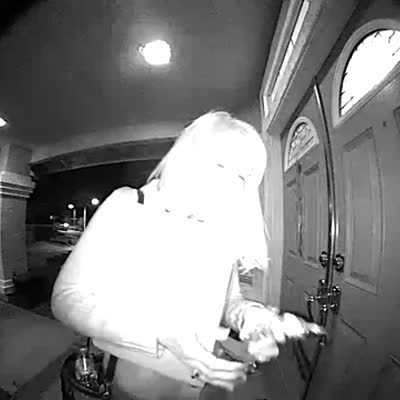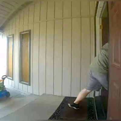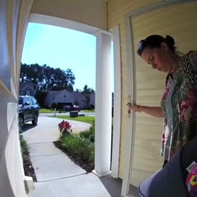 A woman walks out of the house and as she locks up the door, a man talks to her through the doorbell camera and she gets scared.