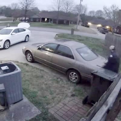 A man in a yard wheels a trash can over to a fence so he can climb on it and jump over the fence but he slips and falls off the trash can. Security camera.