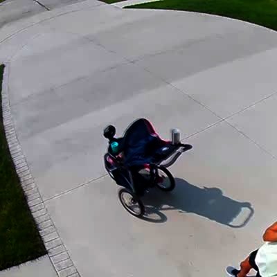 A woman pushes a stroller onto a patio and turns to lock the front door. The stroller rolls away and she runs to catch it. Security Footage