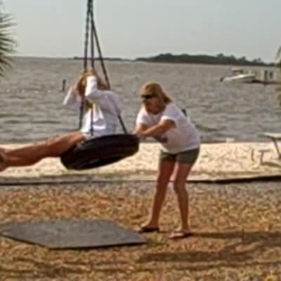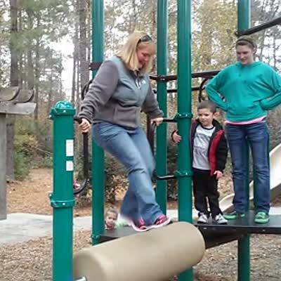 A woman runs on a spinning log at a playground and falls/ face plants.