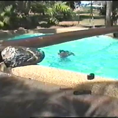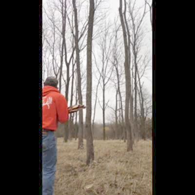 In slow motion, an adult man attempts to chop wood. The log rebounds and hits him in the groin.