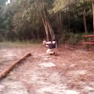 A woman walks on fallen tree as a bridge across a stream. She gets to the other side and slips off. On her way down she grabs a man's head and pulls his hair. He screams