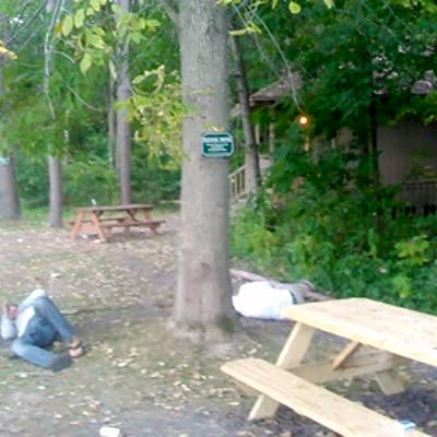 A man stands on some logs and talks on the phone, then falls over and doesn't miss a beat in the conversation in the backyard. Security footage. Ring.com.