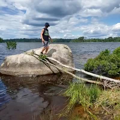 Man tries to walk on a log to cross a river. Slips and falls and hits groin on the log before falling in the water.