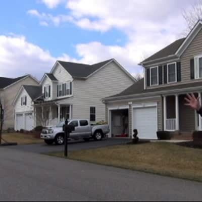 A young boy runs across the top of hay bales on a farm and jumps across a gap between two bales. He hits the edge of the other bale and falls to the ground.