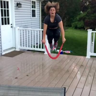 A teen girl jump ropes with a long water balloon on the porch outdoors and it explodes while it's under her. When she lands, she slips in the water and falls down.