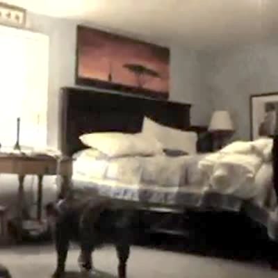 Bulldog in a bedroom jumps up and down on the ground when man taps his finger on the floor. Long for edit. Dog