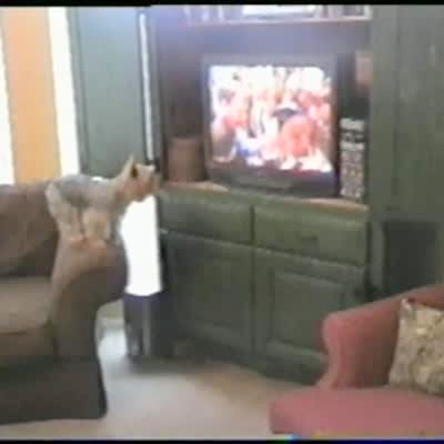 Small dog keeps jumping up and down in front of TV every time he sees a dog on TV. *long for edit