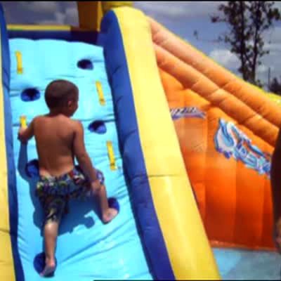 Man jumps feet first through a hole on the side of a water gym. A woman tries to jump through the same hole but bounces back. She falls on the grass.