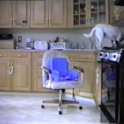 Dog pushes chair to the counter, jumps in the chair so he can eat food off the counter. Long for edit