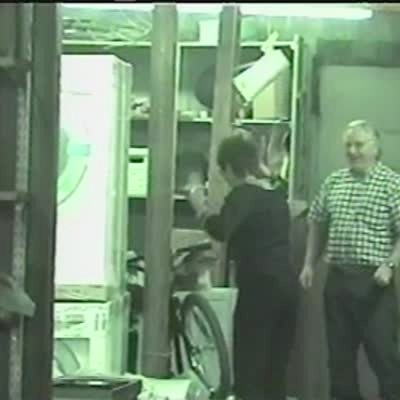 Woman walks by some boxes in an office and a man jumps out and scares her. She screams.
