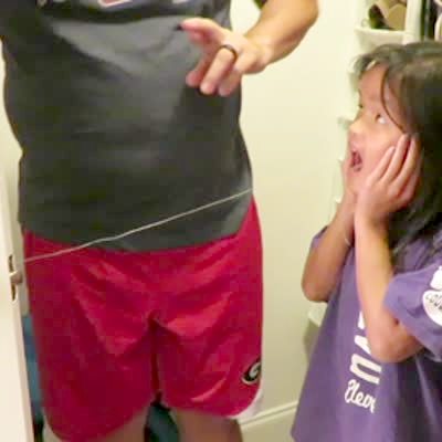A man swings a kitchen cabinet closed to pull a young girl's loose tooth out with string, but the glass on the cabinet breaks and the girl's tooth does not come out.
