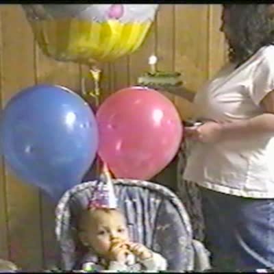 Young girl pops balloons by sitting on them, One sticks to her hair and she doesn't know where it went. She spins around looking for it.