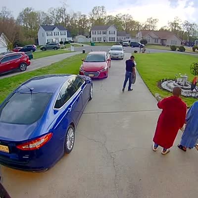 A man moves a planter then thunder strikes and he runs into the house as he flails his arms. Security footage.