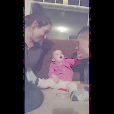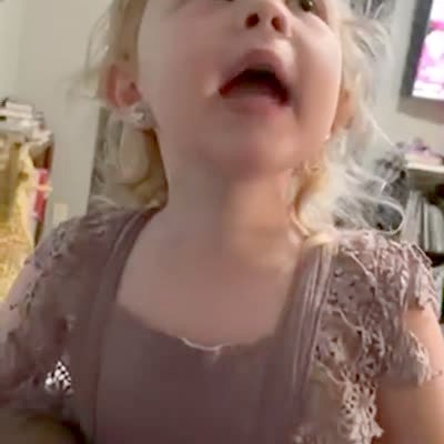 A mother asks her baby girl daughter to say "I love you Dada" at home, and the baby girl burps loudly.