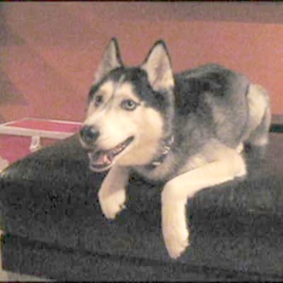 A Siberian Husky is very excited to say, "I love you," to a man and woman on a porch.