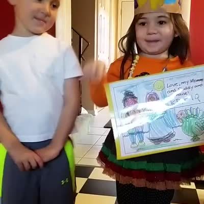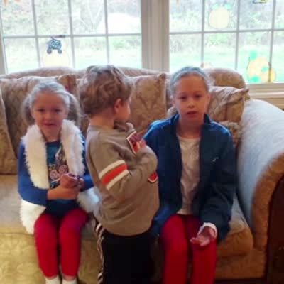 A young girl says she is thankful for "love, my mommy and daddy and my house" and a boy asks, "What about me?" and she says, "Um, I don't wanna be thankful for you" in the living room.