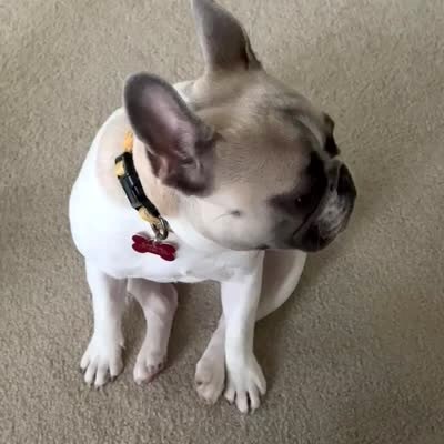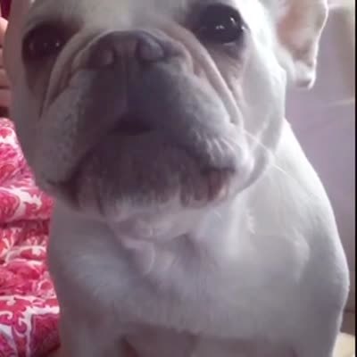 A woman says "I love you" to a French bulldog dog at home, and it sounds like the dogs says "I love you" back.