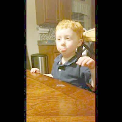 A tot boy says he loves peas as he eats them and gags at the kitchen table.