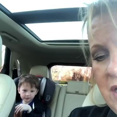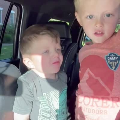 A tot boy in a car says, "Happy Anniversary, we don't love you." Another boy looks at him and asks, "We don't?"