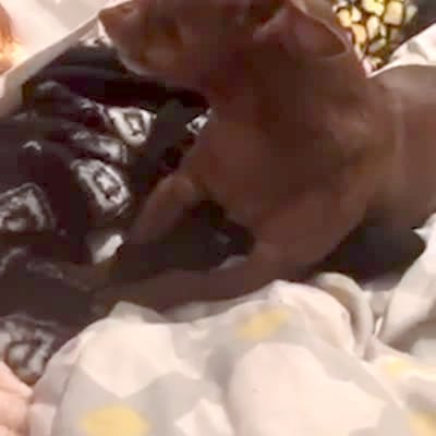 A man pets a Dachsund dog who whines in a backyard, then he asks the dog "is that good loving," and the dog whines a noise that sounds like "uh-huh."