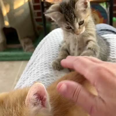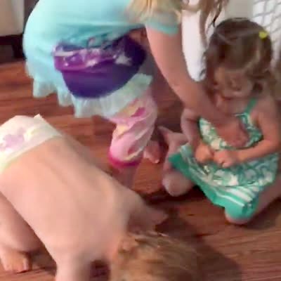 A young girl pats a baby boy on the head. She says, "He's really cute. You wanna pet him?"