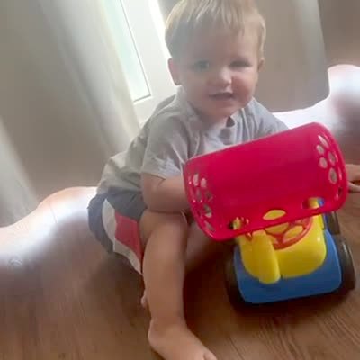 A woman tickles a baby boy and he laughs hysterically. She says "say I love you" and he says it back to her in a bedroom.