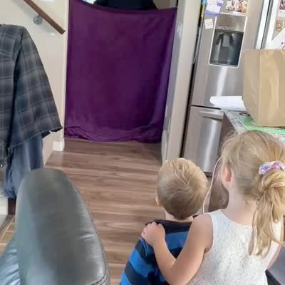 A man raises and lowers a blanket in front of himself before the blanket falls and he disappears. His twin tot boys jump up, look around the blanket for him and whine when they can't find him. Their mom distracts them while the man makes himself reappear.