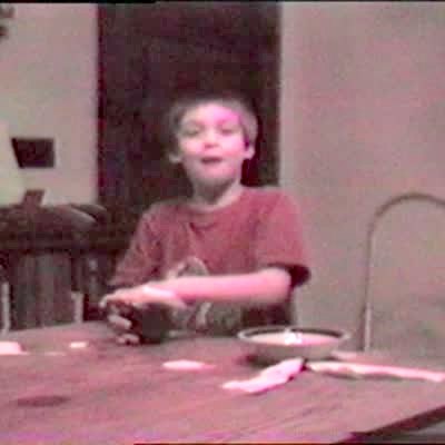 A young boy tries to do the table cloth magic trick, but when he pulls it he throws all the food across the living room. He laughs and says "At least I swept the table clean."