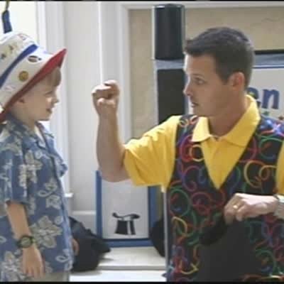 A teen boy shows a tot boy a magic trick and makes a ball appear in the tot boy's ear, hand, shirt and nose.