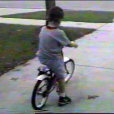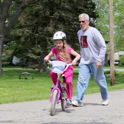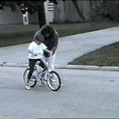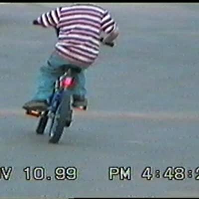 A boy pedals a bicycle around on a street while his mother pushes him. He gets away from her and falls down, crashing into a mailbox. He starts to say that he needs three bandaids and then corrects it to four.