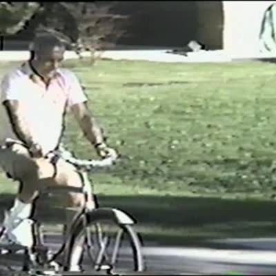 Man rides mountain bike over a jump & crashes into the mailbox, breaking it. Short tail.