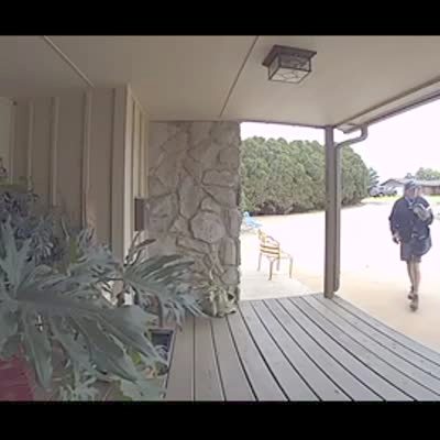 A teen boy reaches into the top of a mailbox to get the mail on a porch, but his hand gets stuck inside. He gets the mail out and continues to struggle with his hand while he complains and calls himself an idiot. Security footage.