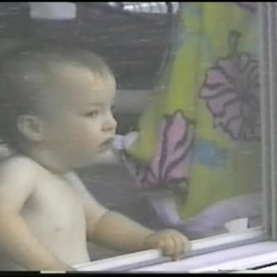 A young boy drives a car straight into a mailbox. His mom jumps over the car to get to the driver's side and stop the car. Security camera footage.