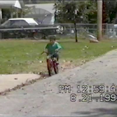 Young boy rides big tricycle, hits a mailbox hard. No recovery. Boy makes great face when he knows he's crashing. Bike, bicycle. good reaction.