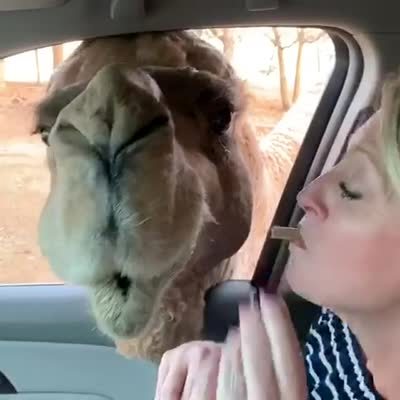 A camel purses out the flaps of its lips as a woman feeds it at a drive through zoo. A man and the woman laughs as it makes the strange face.