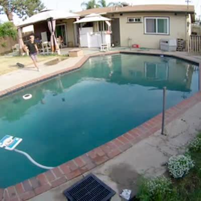 Security footage of a teen boy who curses when his phone slips out of his hand and flies in to the swimming pool in the backyard as he jumps on a skateboard. His mother curses when he tells her what happened, then makes him jump in the pool to get the phone.