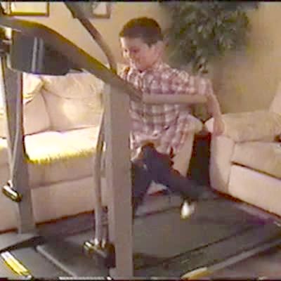A young man tries to stand on a running treadmill in wheelie shoes and falls off, hitting his head. His friends laugh at him.