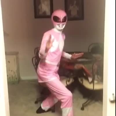 An adult man dressed as the pink mighty morphin power ranger jumps into frame and hits his hand hard against the door frame.