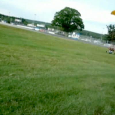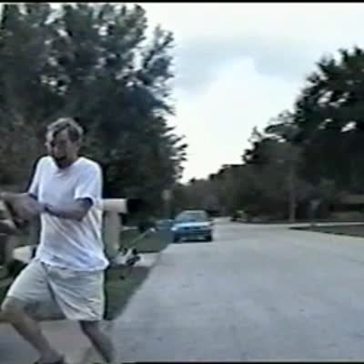 Gas powered toy helicopter chases man down and hits him in the butt- then crashes. -little head/tail-